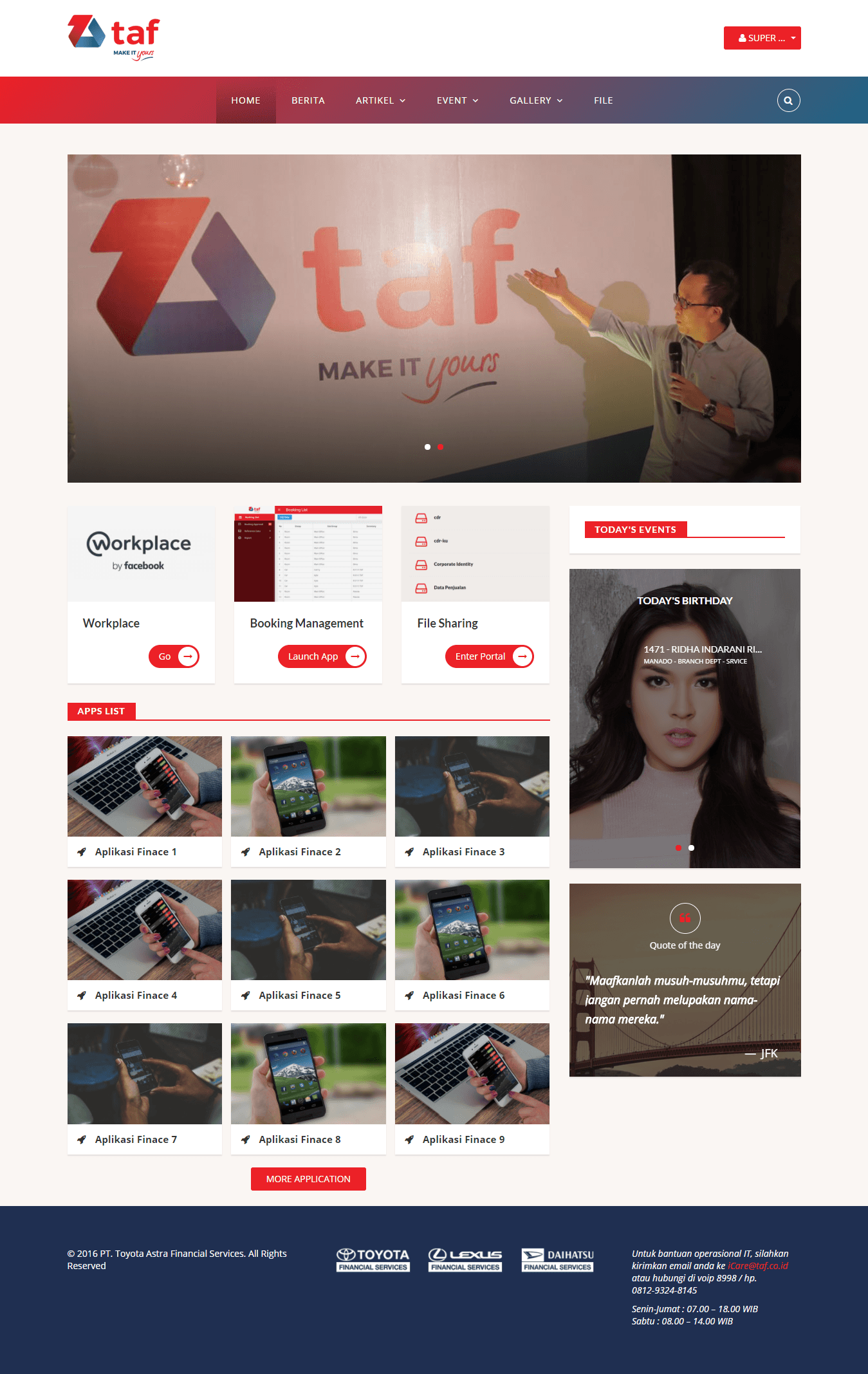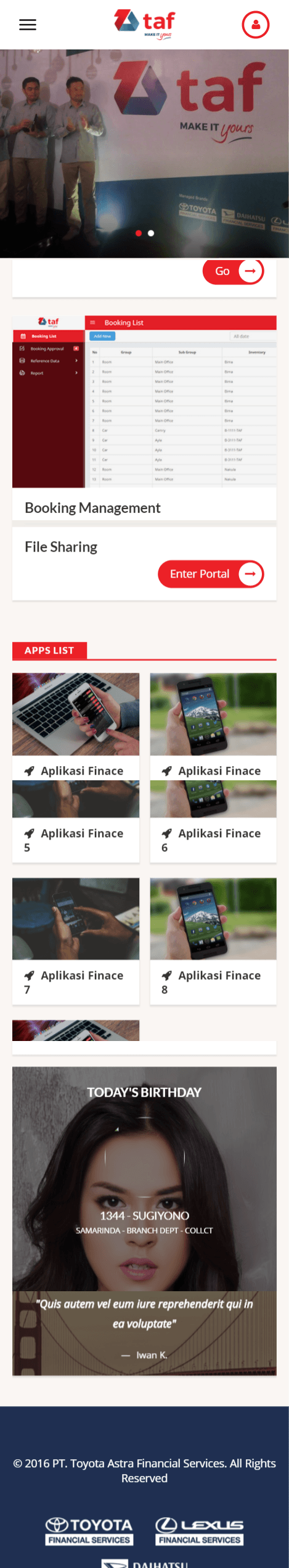 TAF employee portal is an internal corporate portal dedicated to all Toyota Astra Finance employees all over Indonesia. An internal portal such as owned by Toyota Astra Finance helps to improve the quality of communication relationships among employees. A better workplace ecosystem will be formed by having better internal communication.