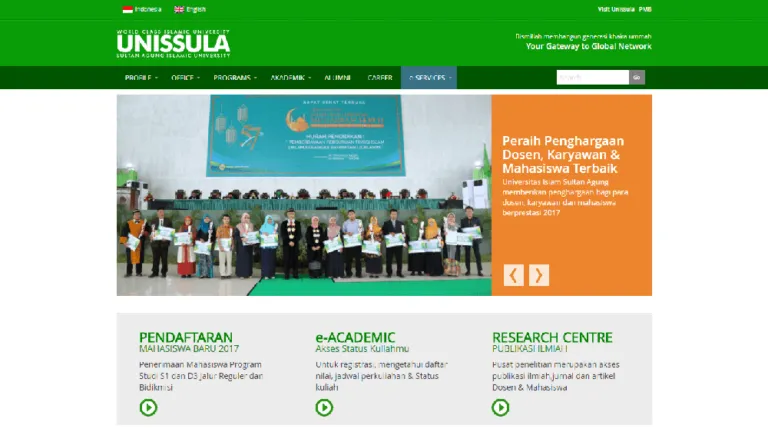 The most interesting feature we provide on the official website of Sultan Agung Islamic University is the e-services feature. This feature has brought many conveniences to the academic community of Sultan Agung Islamic University. Any administrative matters related to academic activities, libraries, databases, etc. can be accessed through this e-service feature. In order to welcome foreign visitors, Unissula’s official website is also designed in two languages.
